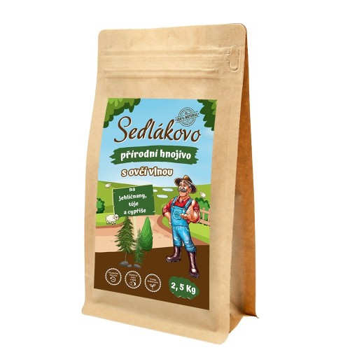 Sedlákovo prírodné hnojivo na ihličnany, tuje a cypreše s ovčou vlnou je najkomplexnejšie organické hnojivo. Je určené pre vonkajšie pestovanie okrasných drevín, predovšetkým tují, cypruštekov, buxusov a ihličnatých drevín. Zlepšuje vlastnosti pôdy a obohacuje ju o živiny. Obsahuje peletovanú ovčiu vlnu s prírodným uhlíkom a humátmi, sedlákovu rohovinu, fermentovaný sedlákov kravský a slepačí hnoj, kostnú múčku obohatenú o kakaové škrupiny a ďalšie organické hnojivá. Funguje ako aktivátor rastu, podporuje tvorbu mikroflóry v pôde, dodáva potrebné živiny, fulvové a humínové kyseliny a v neposlednom rade prevzdušňuje pôdu. Stimuluje biologický život v pôde. Svojimi vlastnosťami výrazne pomáha absorbovať a tiež zadržiavať vodu v pôde. Vďaka obsiahnutým biostimulačným látkam pomáha rastlinám k vitalite a zdravému rastu, zvyšuje ich obranyschopnosť a lepšiemu zvládaniu abiotických stresov. Vďaka obsiahnutej ovčej vlne a rohovine má dlhodobý efekt a hnojivý účinok. Priaznivo pôsobí na vývoj koreňov a celkovú kondíciu rastlín. Zabraňuje degradácii pôdy. Vhodný pre ekologické poľnohospodárstvo. Nezávadný pre hmyz.